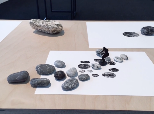 紙の上に置かれた石の上を、黒い人影がジャンプして移動する