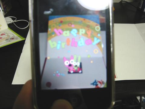 スマートフォン(iPhone3GS)には、既にアラプリがインストールされているので、起動してQRARマーカーを撮影た。すると、一瞬待った後にキャラクターhoops&yoyoが表示され、音楽とともに動き出しお祝いメッセージを表示してくれました。