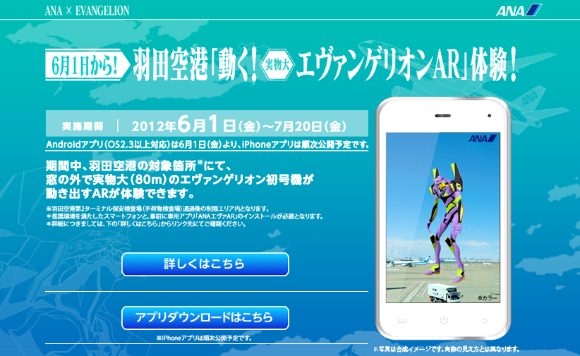 6/1-7/20 ANAが「ANA x EVANGELION」企画の一環として本日より実施する「動 く!実物大エヴァンゲリオンAR」体験!向けに『ANAエヴァAR』 アプリを開発提供した。iPhone版は、順次公開予定とのこと。