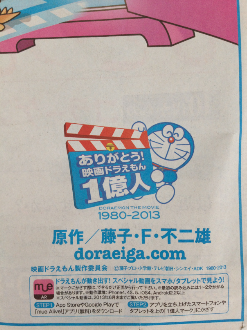 朝日新聞(4月4日)の朝刊で、「ありがとう!映画ドラえもん、1億人」のAR広告実施されている。ある部分にスマートフォンのカメラをかざすと、スペシャル動画が見られるというもの。無料のARアプリケーション