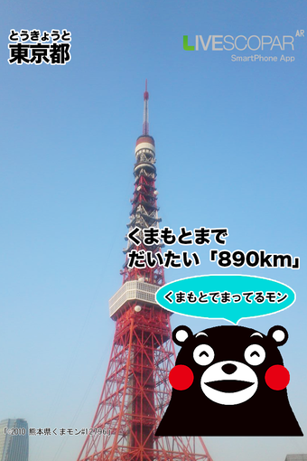 AR アプリケーション「LIVE SCOPAR(ライブスコーパー)」 に、くまモンと一緒に写真が撮れる機能を追加されたよ。熊本県の方角にスマートフォンをかざすと、くまモンが表示されます。くまモンをタップすると、現在の都道府県と 熊本県までの距離が表示され、くまモンと記念撮影ができる。