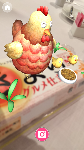 ARは、きよらのパッケージにカメラをかざすと、たまごが10個パッケージの下から出現。たまごタップして、同じ動物が見つけて5つを揃えるゲームが楽しめる。全部揃うと、今度はニワトリとヒヨコが出現。タップするとアニメーションが楽しめる。回したり、写真を撮影してシェアすることもできる楽しい機能になっている。これならば、パッケージは「おもちゃ箱」に入っていくことは、間違いなさそう。