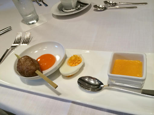 <<Texture & classics>>:ミニ鴨つくね柚子胡椒風味 卵黄と一緒に *** エッグミモザ *** スクランブルエッグ with グリュイエルチーズ