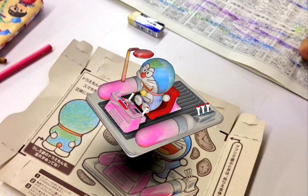 グリコ・ポッキー等の箱の裏についてるドラえもんのおまけがすごい!と話題に。これは、いわゆるAR(拡張現実)技術を応用して実現されたアプリ。