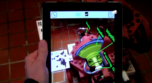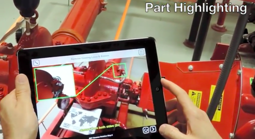 機器にiPadのカメラをかざすと、部品の取り外し方や部品の交換方法が実物の機器上にデジタルデータでオーバーレイ表示される。ポイントとなる箇所から吹き出しを表示して、動画で詳しく説明をする実用的な機能となっている。このビデオを見る限りでは、機器本体を認識しているのではなく、機器に設置された世界地図を画像認識し、相対的に情報を表示しているように見える。機器そのものを正確に認識させることは、まだ難しいため、このような方式が良いかもしれない。