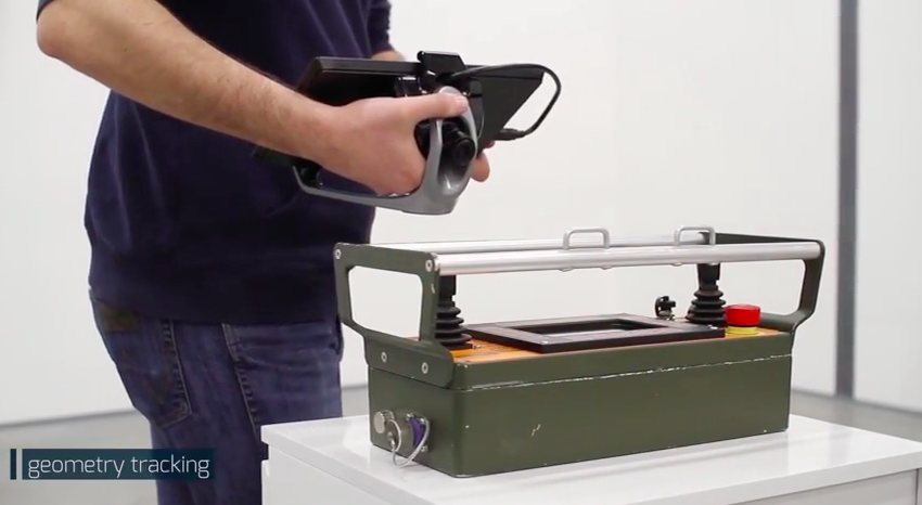機器のメンテナンスを支援するソリューションの紹介。機器にスマホのカメラをかざすと、操作方法やメンテナンス方法を3DCGのアニメーションで説明するというもの。タブレット本体のカメラではなく、外付けのカメラを端末の中心に装着する方式と外部カメラで実現している点がとてもユニークだ。