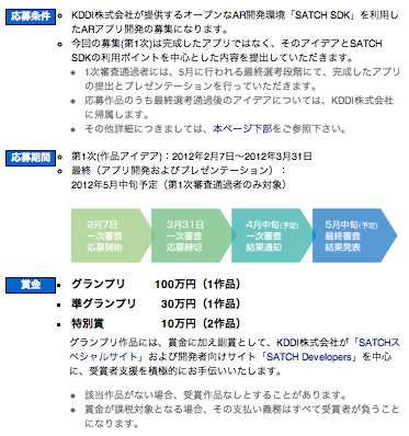 これまで日本のARは企業主導のキャンペーンでの利用が数多く見られました。しかし、2011年以降スマートフォンの普及とともに、ARがもたらすユーザ体験が私たちの生活により身近になってきました。また、KDDIによる「SATCH」の展開により、ARアプリの開発環境を向上しました。今回、さらにARを身近にすべく、エンジニア・クリエイターを対象としたコンテストを実施いたします。皆さんからの斬新なアイデア、未来を拓く可能性が秘められた作品をお待ちしております。