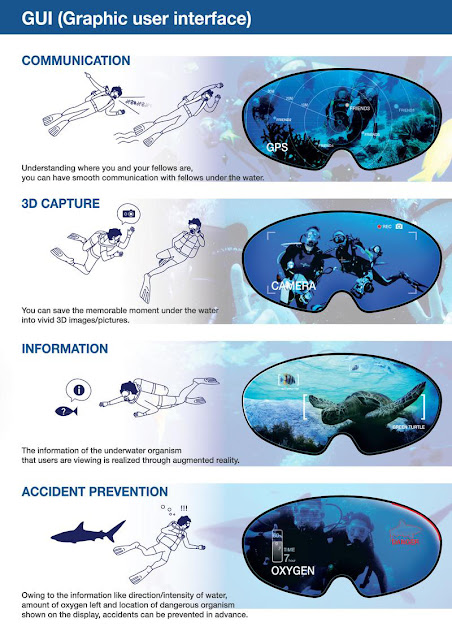Smart Swimming GogglesIf you are an avid diver then I am sure you will appreciate the concept of the Smart Swimming Goggles. This simple eye cover actually assists with communication between divers and capturing of memories in photo and video format.Their purpose is to improve communication amongst people underwater. As a secondary purpose, they offer exceptional video and 3D camera capabilities. In addition to all this, these swimming goggles come with an augmented reality display(via http://alekhyamantha.blogspot.jp/2013/09/smart-swimming-goggles.html)