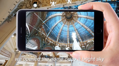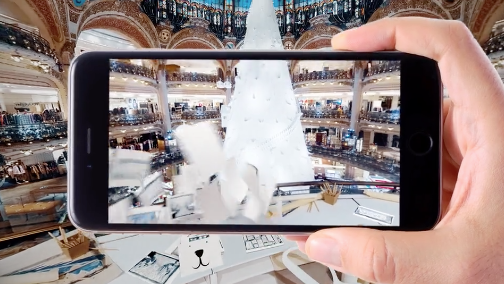 On the second floor of the main store at Galeries Lafayette Haussmann Paris, shoppers are positioning themselves at one of the corbelled arches of the majestic dome, they point their device to a piece of paper showing a drawing of a polar bear to find themselves immersed in a dreamlike story that unfolds across 360° around the dome. A polar bear walks through the snow right before our very eyes as if it were actually roaming around inside the store! Virtual snowflakes fall, draping the entire dome in a beautiful white shroud.