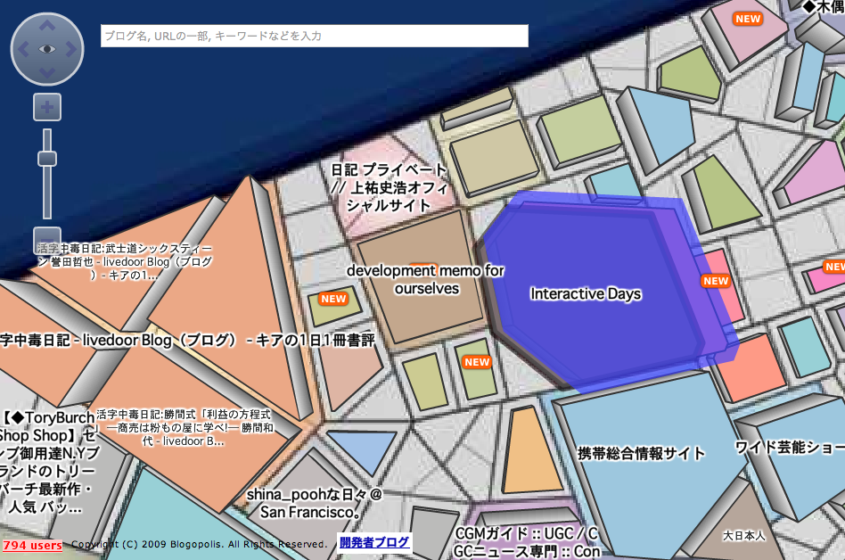 TopHatenarのページに新しいサービが公開されていた。早速自分のブログがどこにあるか探してみたら....まだNewとして表示されたばかりだった。このように鳥瞰的な視点でサイトが見られるのは、なかなか楽しい。