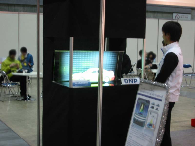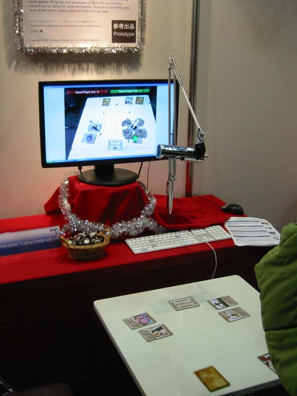 DNPはARミュージアムで有名だ。こちらもKGTと同様metaioのが技術を使用している。真っ白な自動車のモデルに、ARの技術を使用し、走っているように見える映像を重ね合わせていた。その他は、junaio、カードゲーム等のデモを展示していた。