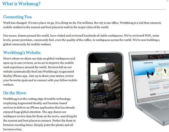 WorkSnug connects mobile workers to the nearest and best places to work in the city. Get started at WorkSnug.com or download the free augmented reality app at the iTunes Store: It's like Sci Fi, and it's free!