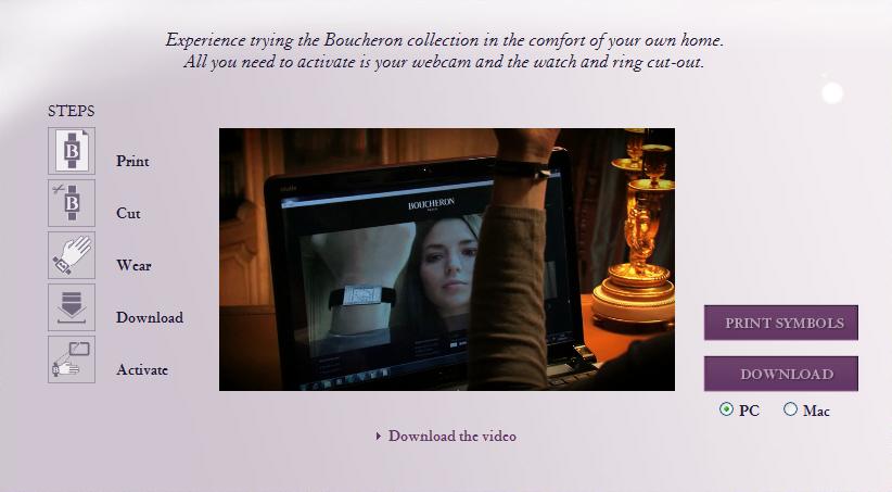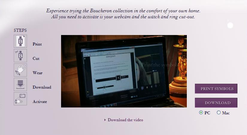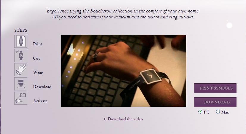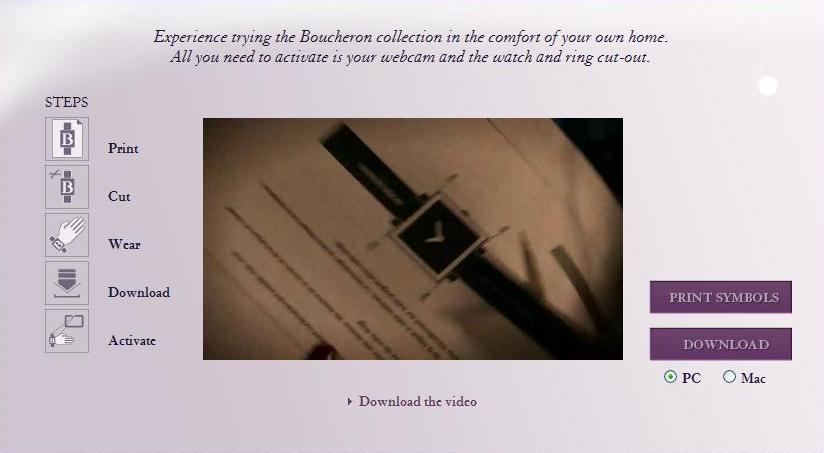 さて、伝説的なフランスの宝石商である Boucheron (ブシュロン) は、サイト訪問者が WebカメラとPCの画面を使用して時計や指輪の試着が行えるサイト、myBoucheronのアプリケーションをリリースする。本物そっくりの3D腕時計や指輪をあたかも装着しているように試すことが出来る。下記の画像と説明をご覧いただきたい。
