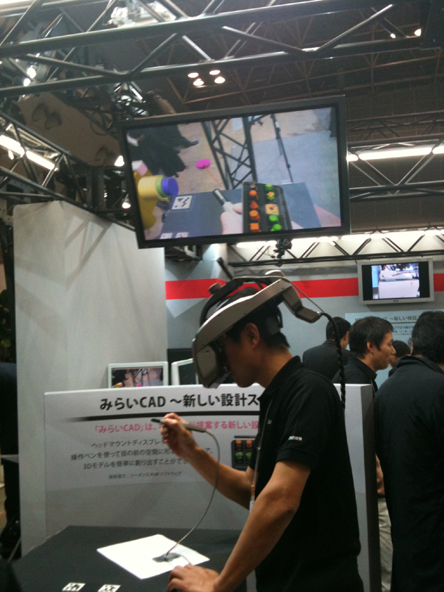 下記もMRをHMDで試している様子だ。上を向いたら会場の天井まで届く位の巨大な建造物が見えた(左側)。右側は、MRの技術を使用した未来的なCADだ。
