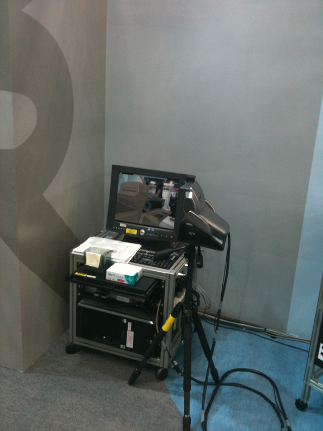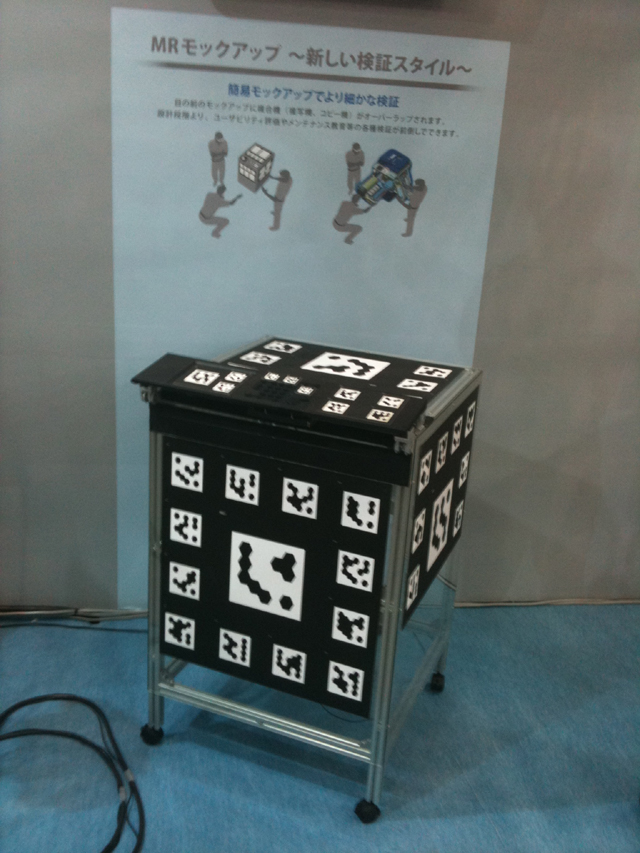 こちらは、有名なMRコピー機。操作パネルが付いた箱のような外観に、異なる複数のARマーカーが全体に貼られている。HMDを装着することで、完成品の外観を見ることができ、操作パネルを押すことで操作することも出来る。話には聞いていたが、本当にそこにコピー機が有るように見えた。右側の写真のディスプレーにHMDから覗いたときの様子が映し出される。