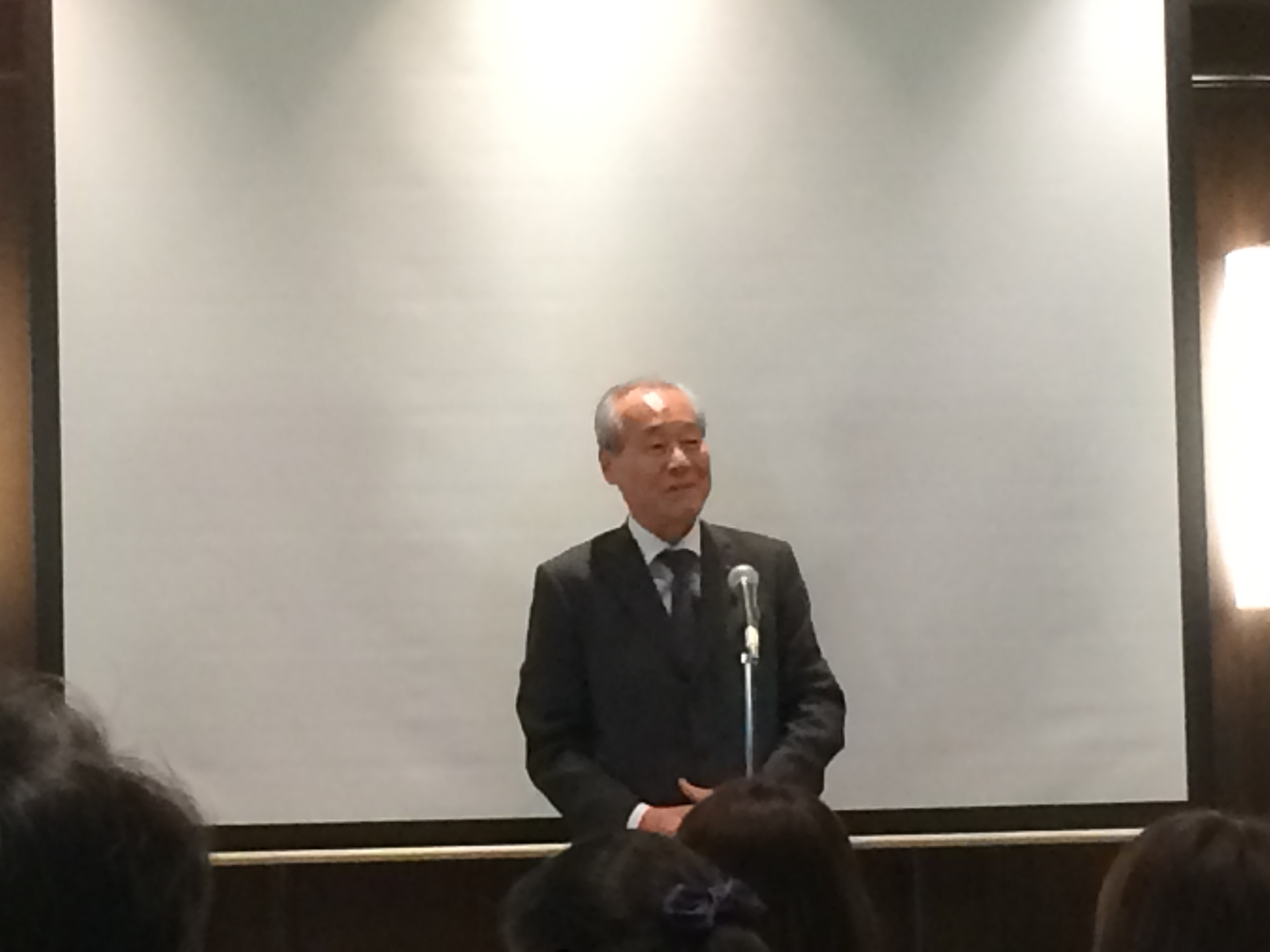 秋田社長のスピーチ。80歳代とは思えない若さ。100億の投資により夢を実現したという。独自の栄養設計による特許出願中の新旨味原料で作った飼料など「きよらかな鶏の飼養」