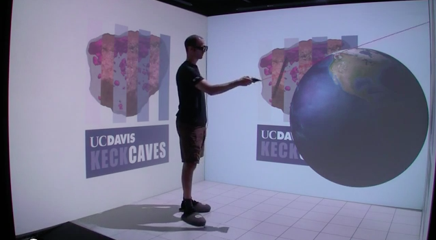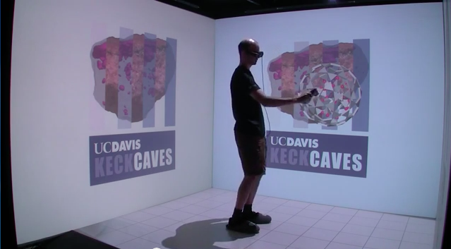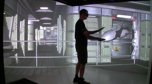 A simulation of low-field-of-view augmented reality (AR), using the estimated FoV of Microsoft's HoloLens (30 x 17.5 degrees). Filmed in a CAVE VR environment, using custom code to put "virtual blinders" on the user. The blinders create a truncated pyramid locked to the viewer's head, 30 x 17.5 degrees wide with the pyramid's top rectangle being 24" from the viewer's eyes.