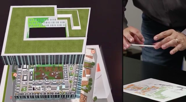 スマートフォンで印刷されたマーカーを読み取り、ARを実行すると建物が表示される