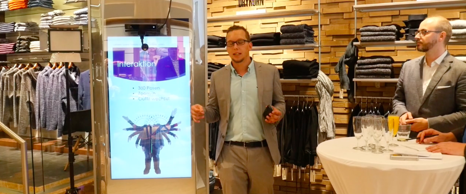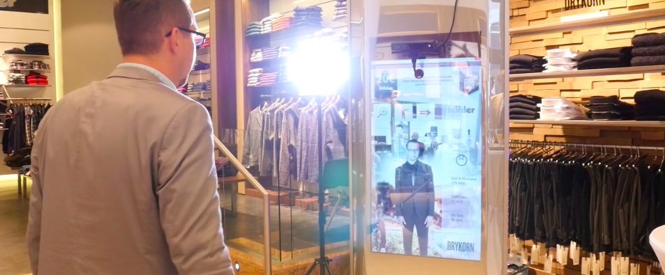 Der Kunde stellt sich vor eine Stele und wird durch ein Verfahren automatisiert erkannt und sieht sich selbst mit der Mode von DRYKORN PRODUCT®, ohne Anprobieren. Er kann sich drehen und bewegen, wie vor einem normalen Spiegel. Die Sensoren erkennen das Geschlecht, das Alter und die Konfektionsgröße des Users.